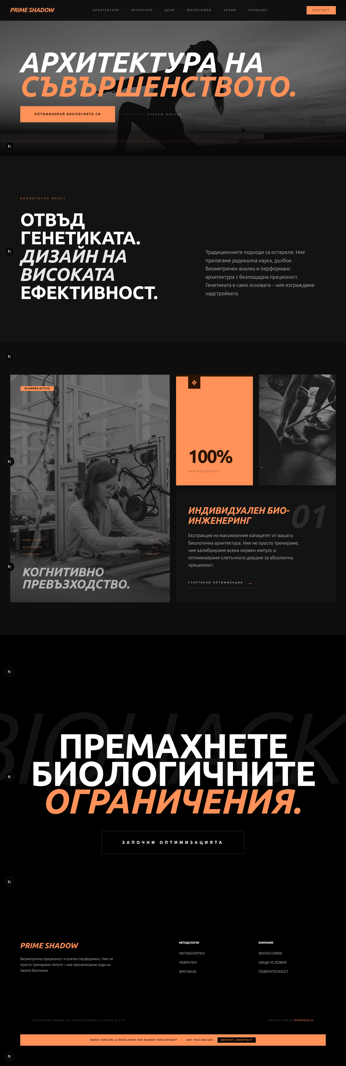 Точно затова ние от Mobigrab създадохме PRIME SHADOW – дигитален продукт от най-висок клас, който позиционира услугите ви в премиум сегмента. Тази архитектура е проектирана за максимална конверсия, гарантирайки, че първото впечатление на всеки посетител води до безусловно доверие.